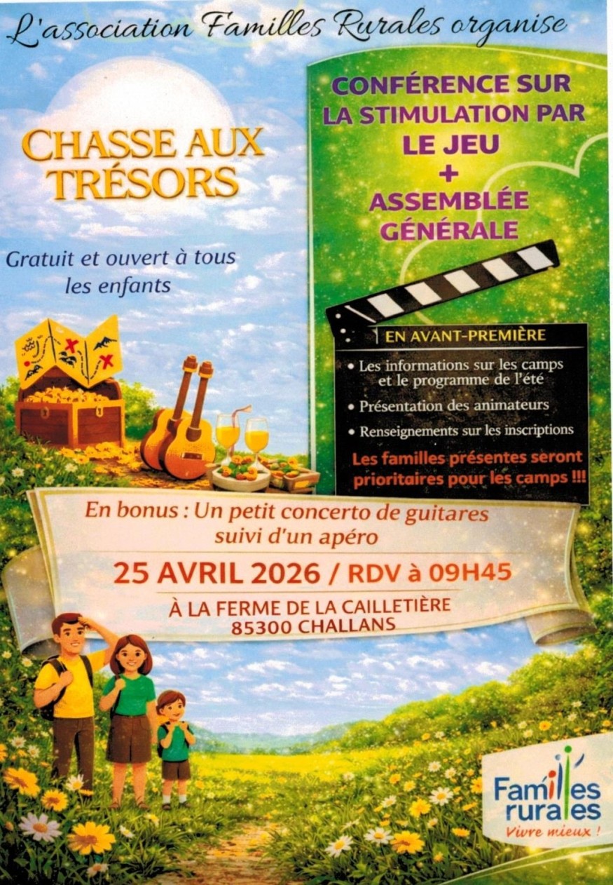 A Challans, Familles rurales annonce Assemblée Générale, jeux et portes ouvertes ce samedi 25 avril.
