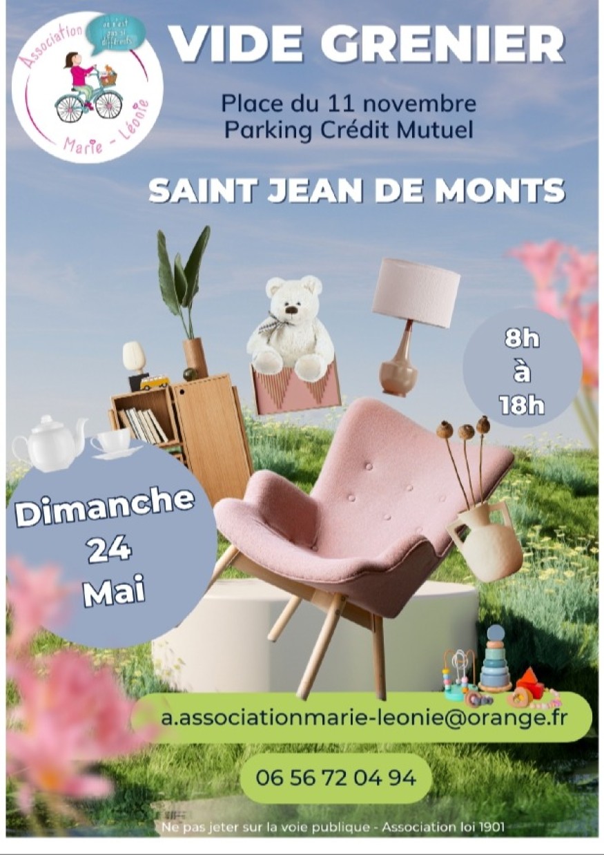 L’association Marie-Léonie lance les inscriptions pour son vide-grenier programmé le dimanche 24 mai à Saint-Jean-de-Monts, Place du 11 Novembre (parking du Crédit Mutuel).