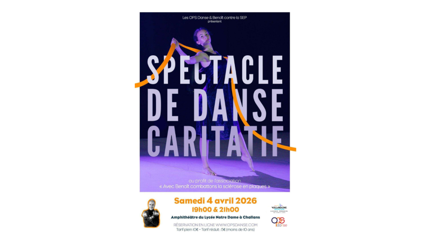 Les OPS danses organisent un spectacle de danse caritatif au profit de l'association "Avec Benoît combattons la sclérose en plaques", qui aura lieu le samedi 4 avril 2026 à Challans, avec deux représentations à 19h et 21h.