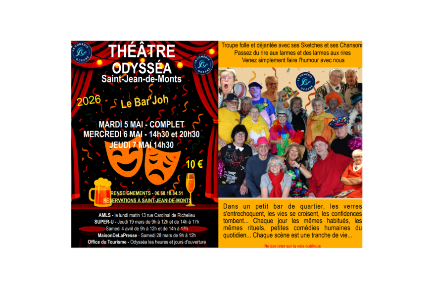 La nouvelle pièce "Le Bar'Joh" de la Comédie Océane se tiendra le mercredi 6 mai (14h30 et 20h30) et le jeudi 7 mais (14h30). C'est au tarif de 10€ et ce sera au théâtre d'Odyssea, à Saint-Jean-de-Monts. Renseignements par téléphone : 06 68 18 84 51